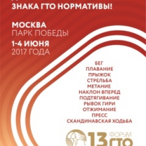 С 1 по 4 июня 2017 г. в г. Москве, в Парке Победы на Поклонной горе пройдет 13-ый Физкультурно-спортивный форум «Готов к труду и обороне» в рамках которого любой желающий может выполнить нормативы комплекса ГТО.